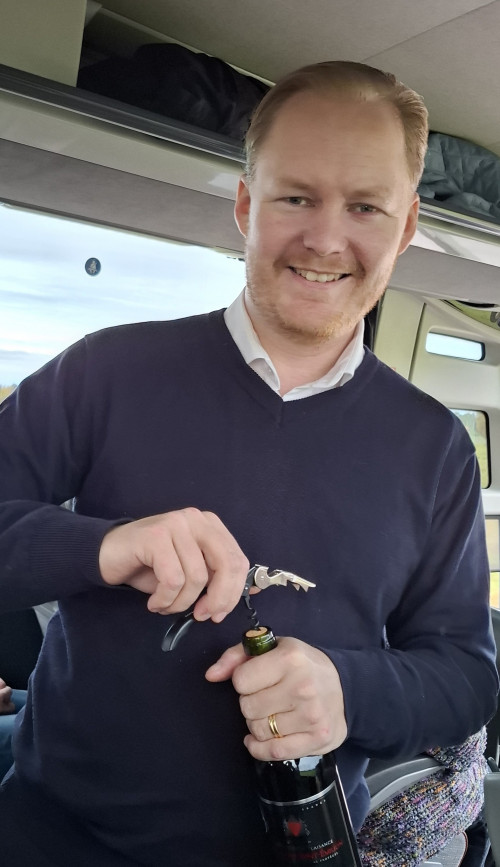Vår "egen" sommelier Henrik Fredriksson ordnade en fantastisk resa för vårens vinprovargäng till Grythyttan och Saxå Bruk, där Carl Jan Granqvist var vår värd. Och som sig bör - givetvis blev det vinprovning i bussen.